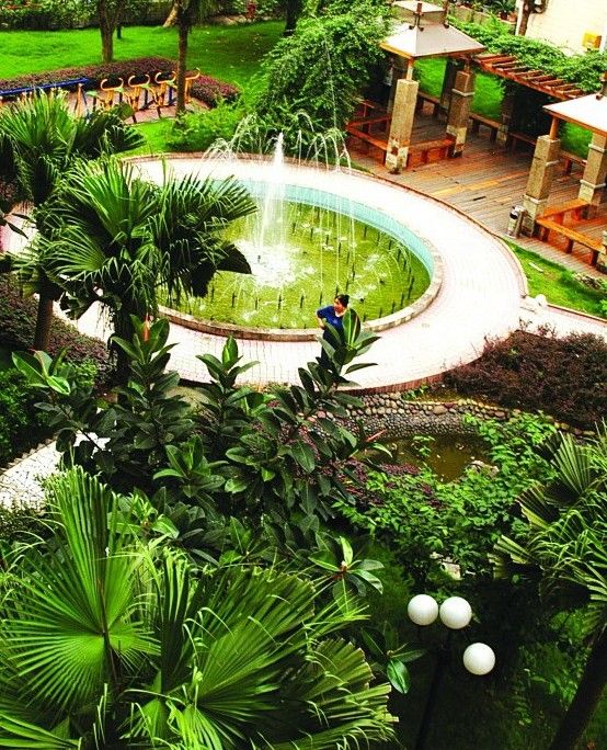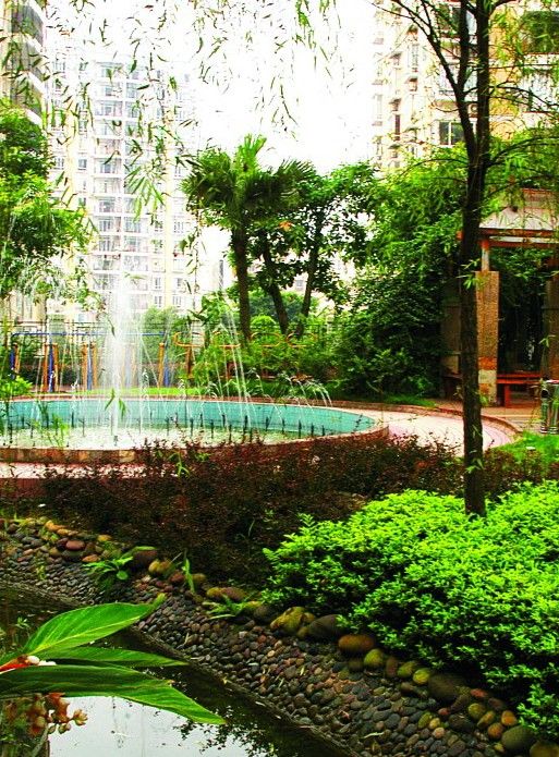 从居民楼对中庭的小角度鸟瞰,各种石景元素掩映在葱苍绿化中,相得益彰